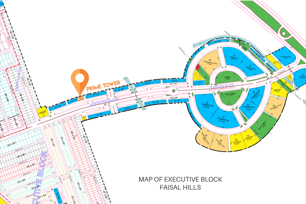Prime Tower is the first-ever project in Faisal Hills, Executive Block, located on Main G.T. Road, Taxila, and just a 15-minute drive from the New International Airport, Islamabad. Faisal Hills is an emerging new city in the heart of the Gandhara Civilization, Taxila, near B-17, Islamabad.
